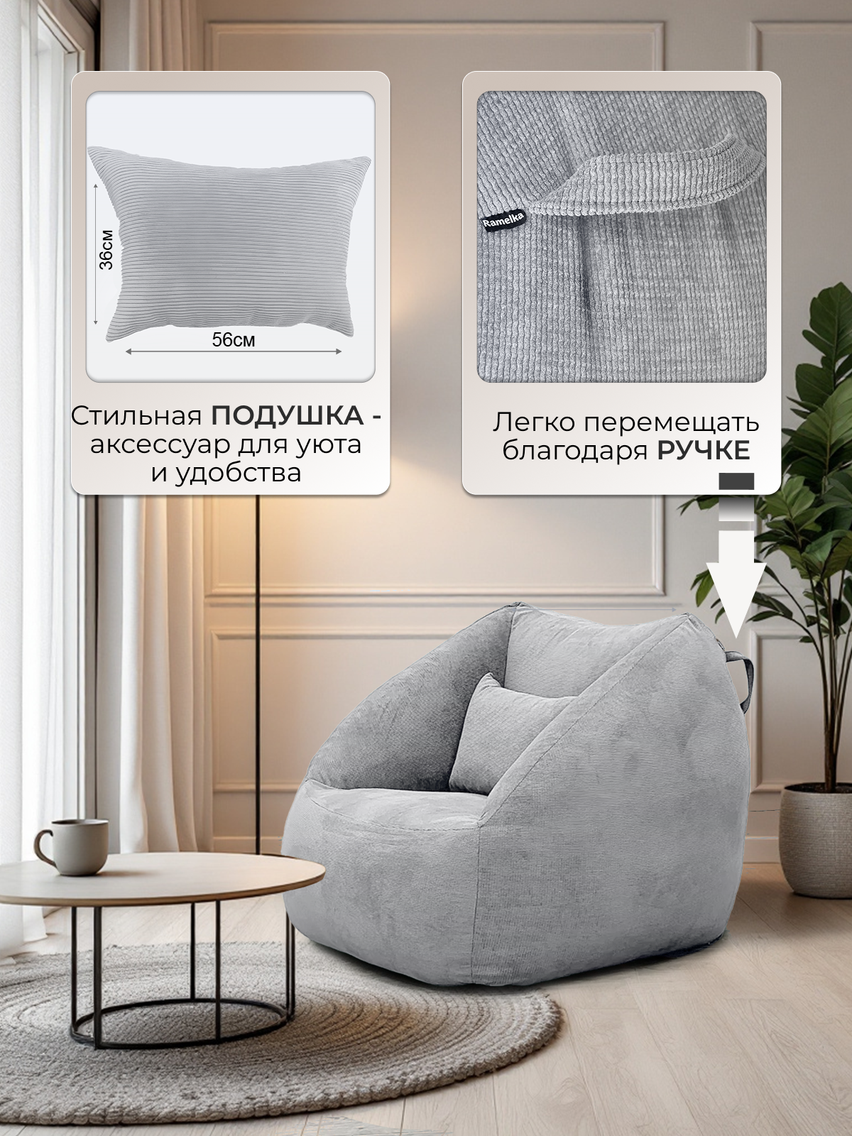 Отзывы на Кресло-пуф бескаркасное Ramelka CAPRI, микровелюровый чехол, съёмный, серый