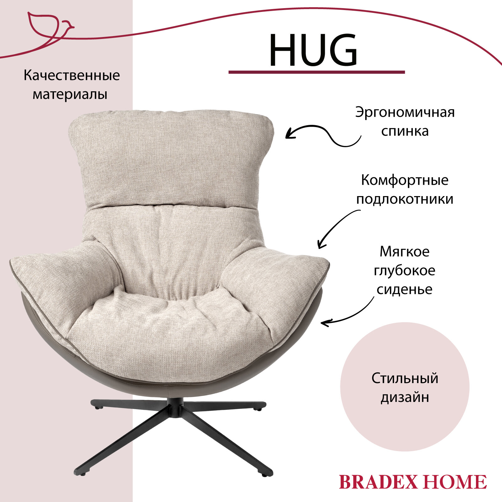 Кресло мягкое для дома HUG светло-серое, экокожа, шенилл, для отдыха в гостиную, крутящееся 360 на ножке информация:
