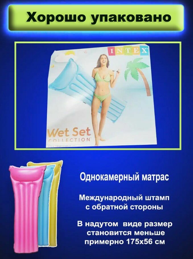 Матрас надувной для плавания Intex 59703 голубой, с подголовником, до 100 кг, для детей и взрослых информация: