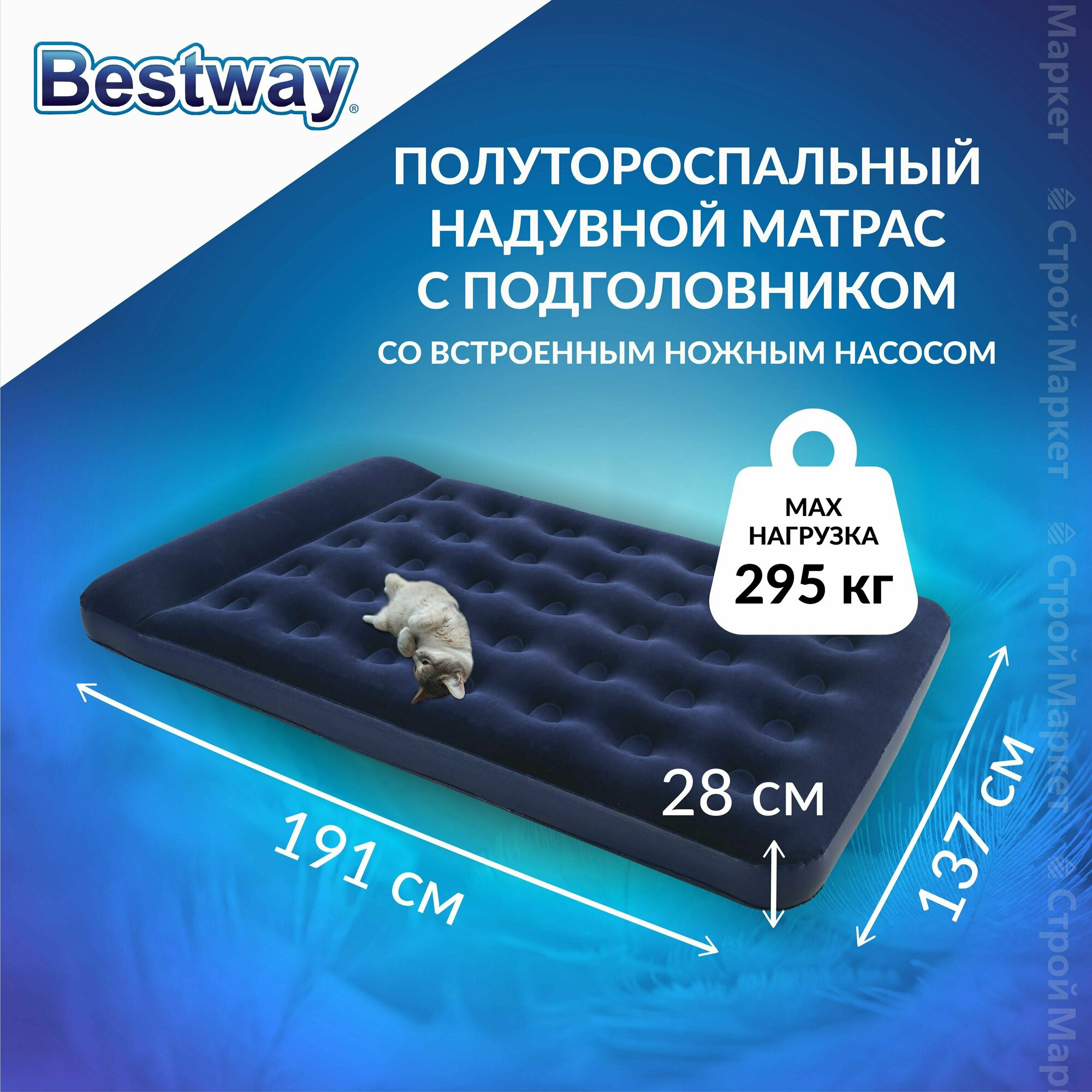Надувной матрас 137х191х28см с подголовником, встр. ножной насос, до 295 кг информация:
