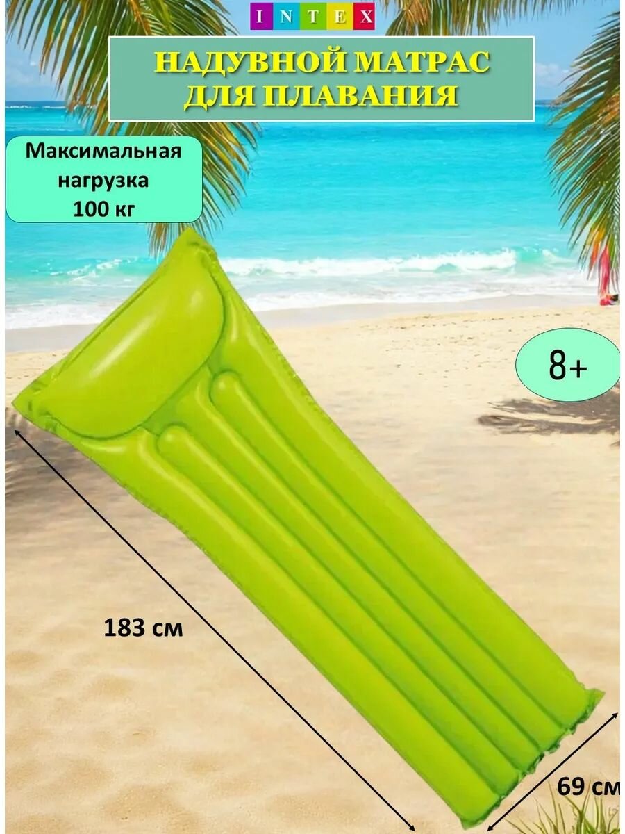 Intex Надувной матрас для плавания и купания с подголовником для бассейна и пляжа 183х69см, до 100кг зеленый 59703NP информация: