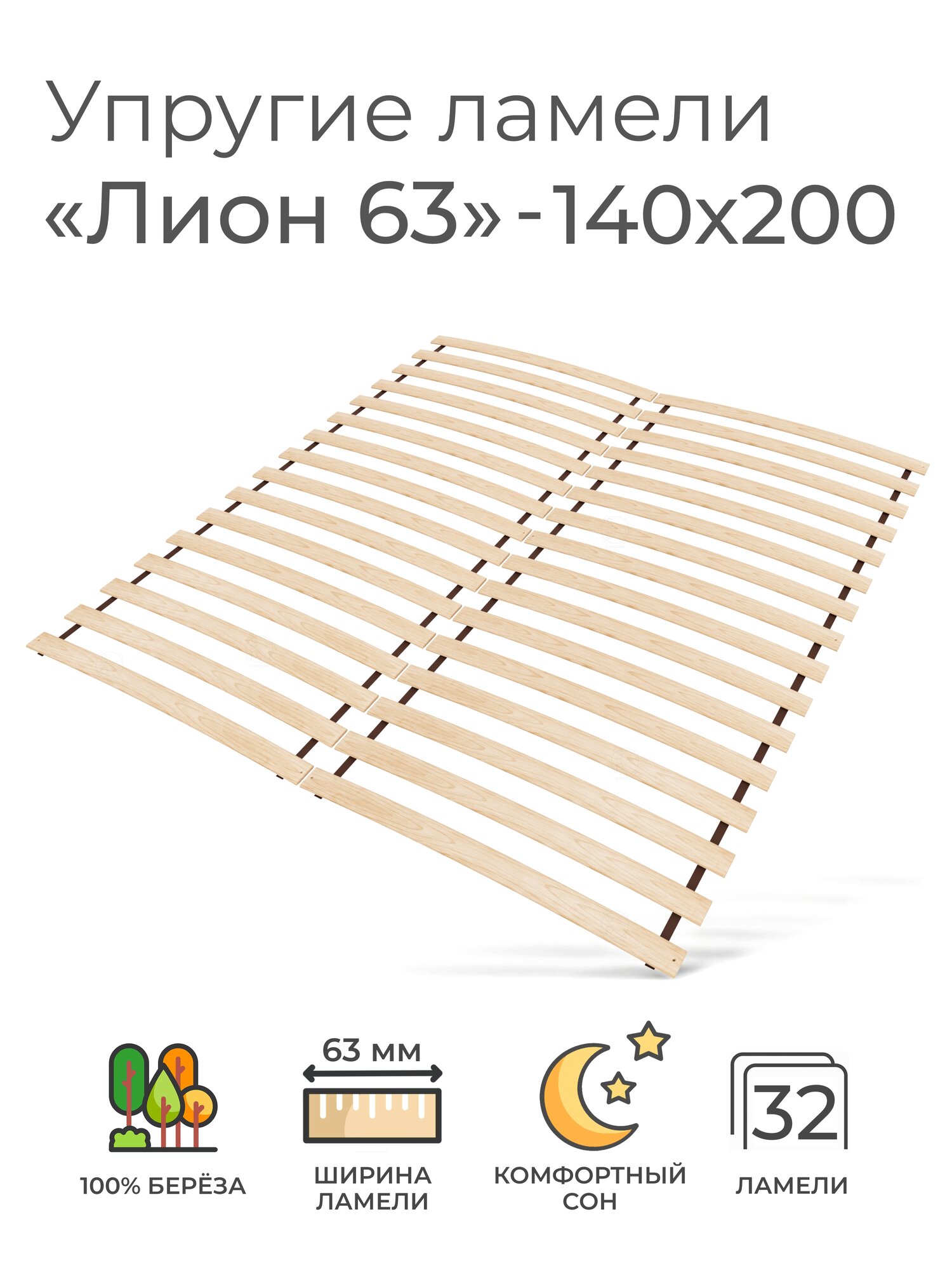 Упругие ламели "Лион 63", 140х200 (ортопедическое основание для кровати, ламели 700 мм, реечное дно, основа под матрас односпальной кровати) информация: