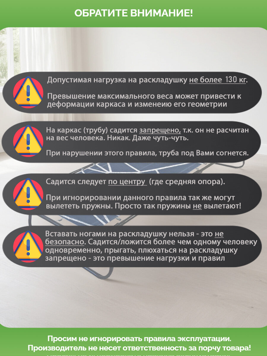 Раскладушка взрослая без матраса для сна, нагрузка до 130 кг информация: