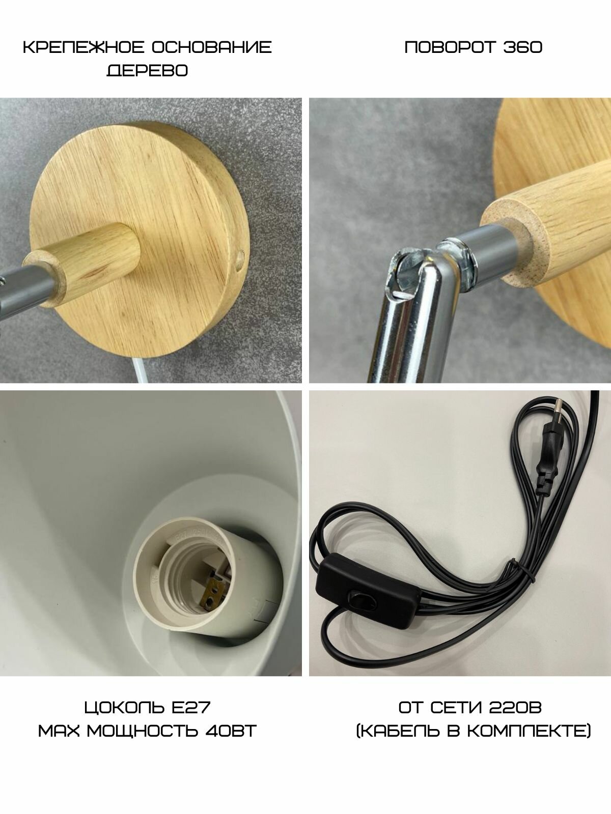 Светильник настенный бра с выключателем под лампу Е27, белый/дерево информация: