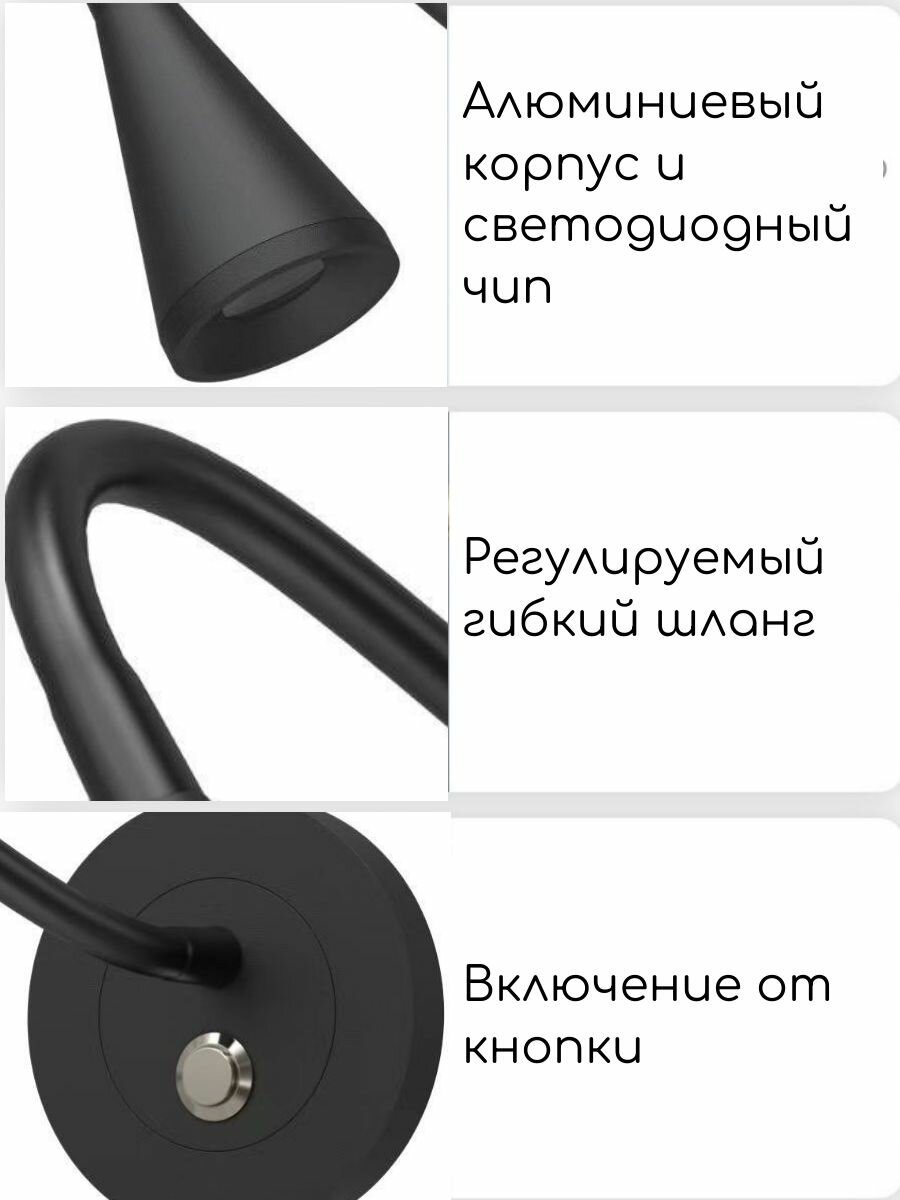 Светодиодная настенная лампа с выключателем, Бра гибкий для спальни, гостиной, кухни Wogow Черный 1 359 ₽