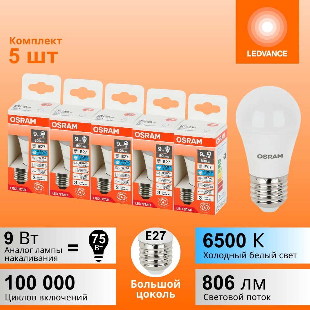 Отзывы на Лампочки светодиодные OSRAM LED STAR, 9Вт, 5 шт в наборе, Е27, 6500К холодный белый свет, 806лм, колба Р шар матовая пластик