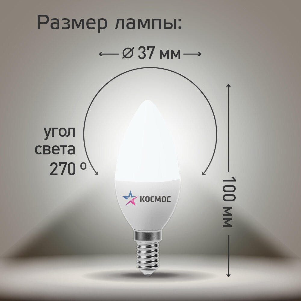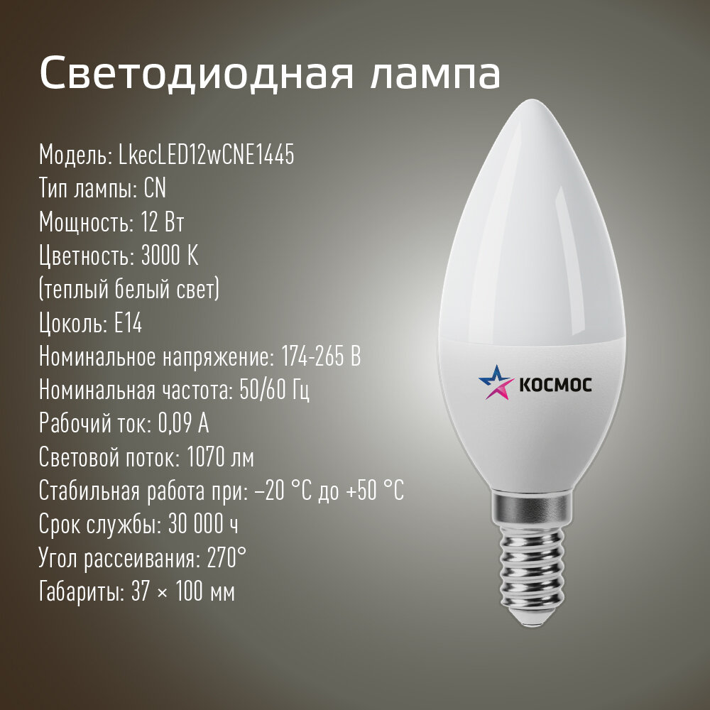 Лампочка Космос LED12wCNE1445, E14, 12Вт дневной белый свет 4500К информация: