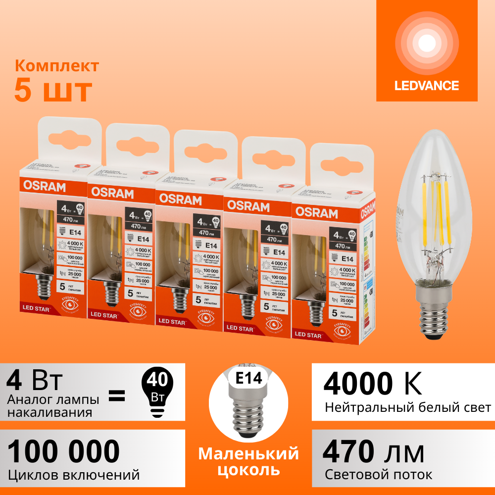 Отзывы на Лампочки светодиодные филаментные OSRAM LED STAR, 4Вт, 5 шт в наборе, Е14, 4000К нейтральный белый свет, 470лм, колба В свеча прозрачная стекло