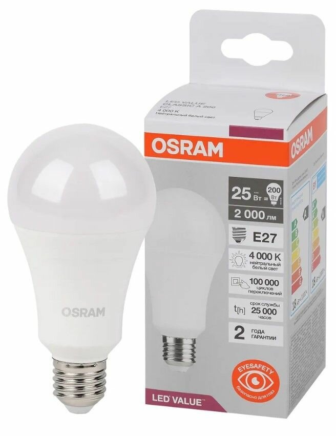 Отзывы на 5шт/уп. Лампа LED Груша 18Вт 220-240В E27 2000Лм 4000К Угол 180 град. d 65mm h 132mm Свет Дневной белый Osram, уп. 5шт