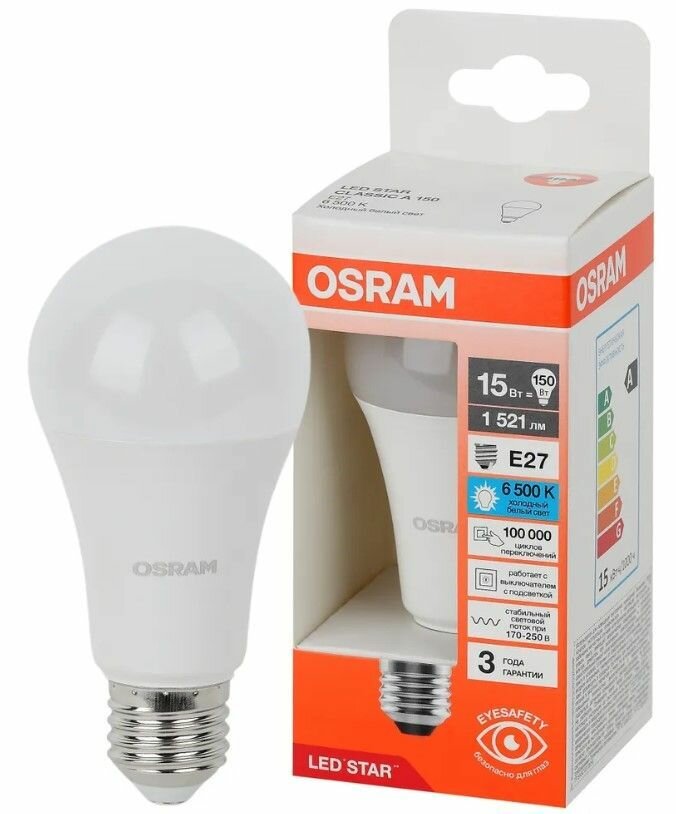 Отзывы на 5шт/уп. Лампа LED Груша 15Вт 170-250В E27 1521Лм 6500К Угол 180 град. d 60mm h 125mm Свет Холодный белый Osram, уп. 5шт