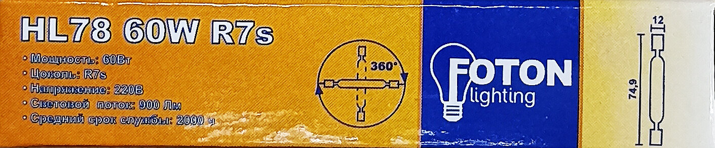 5шт/уп. Лампа Галогенная Линейная 60Вт 220-240V R7s LINE 900Лм 3000К D-12mm L-78mm Диммируемая Свет Теплый белый Foton Lighting, уп. 5шт информация: