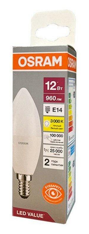10шт/уп. LED Свеча 12Вт E14 220-240В 960Лм 3000К Свет Теплый белый 113х37мм OSRAM, уп. 10шт информация: