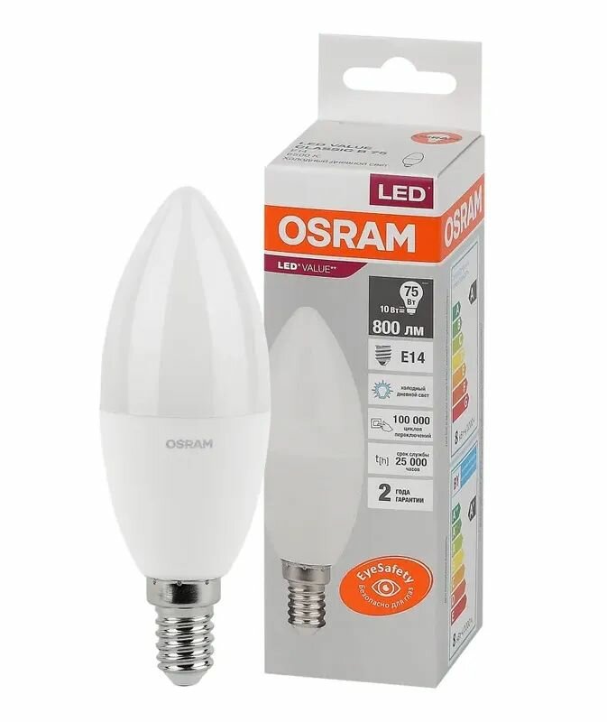 Отзывы на 3шт/уп. Лампа LED Свечка 10Вт 220-240В E14 800Лм 6500К Угол 200 град. d 39mm h 114mm Свет Холодный белый Osram, уп. 3шт