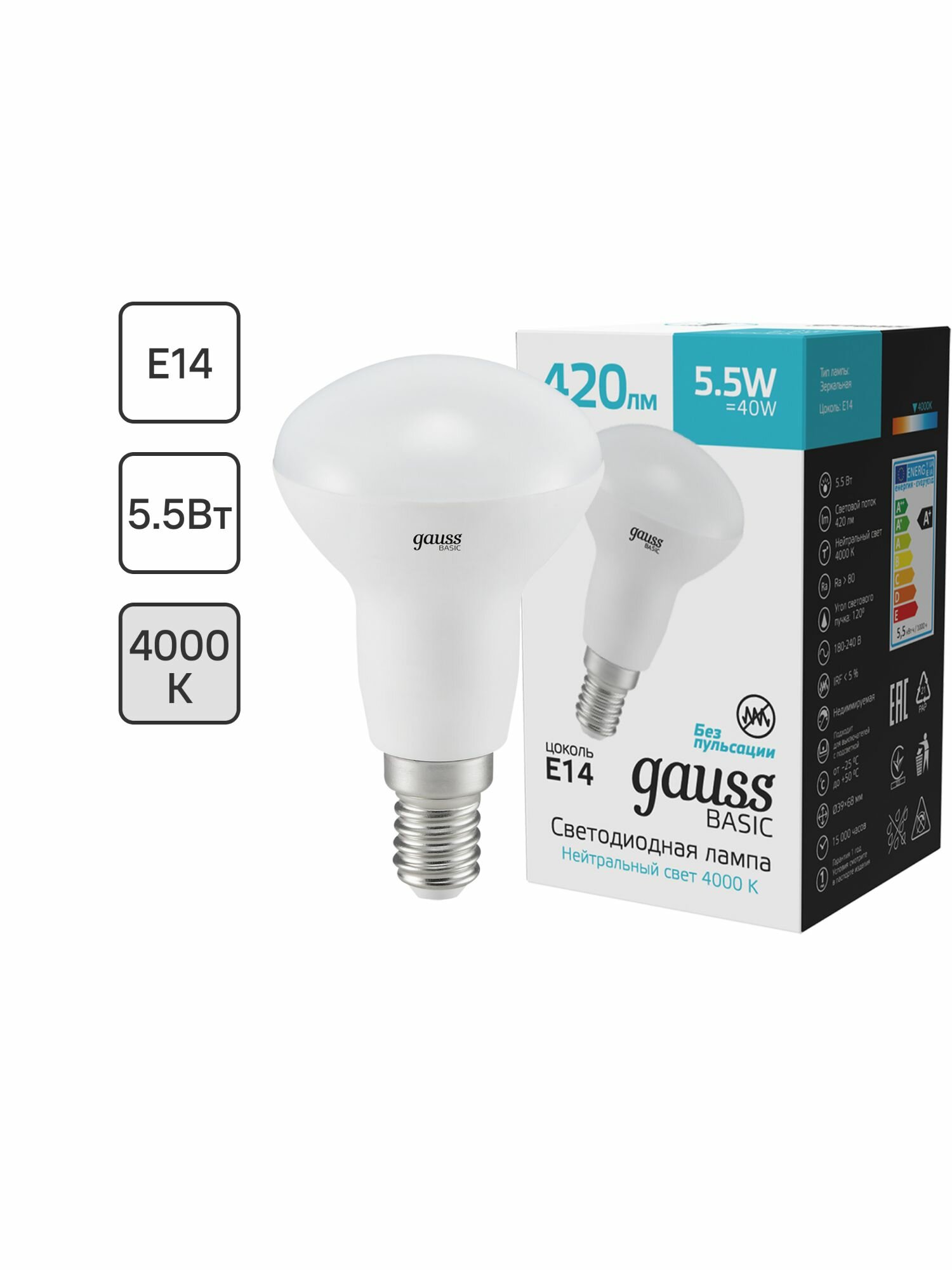 Лампа светодиодная Gauss R39 E14 170-240 В 5.5 Вт гриб матовая 420 лм, нейтральный белый свет информация: