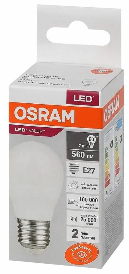 Отзывы на 2шт/уп. Лампа LED Шарик 7W 230V E27 560Лм 4000К Угол 180 град. D-47mm L-88mm Свет Дневной белый OSRAM, уп. 2шт