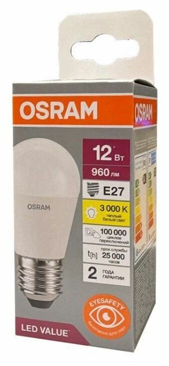 Отзывы на 3шт/уп. Лампа LED Шарик 12Вт E27 230В 960Лм 3000К Свет Теплый белый 89х45мм OSRAM, уп. 3шт