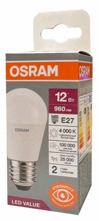 Отзывы на 1шт/уп. Лампа LED Шарик 12Вт E27 230В 960Лм 4000К Свет Дневной белый 89х45мм OSRAM, уп. 1шт