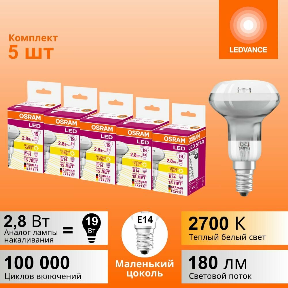 Отзывы на Лампочка R50 светодиодная OSRAM LED STAR, 5 шт, 2.8Вт, Е14, 2700К теплый белый свет, 180лм, колба прозрачная стекло