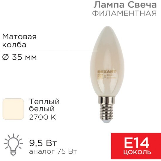 Лампа филаментная Rexant Свеча CN35, 9.5 Вт, 915 Лм, 2700K, E14 в матовой колбе информация: