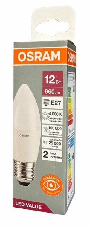 Отзывы на 1шт/уп. Лампа LED Свечка 12Вт E27 230В 960Лм 4000К Свет Дневной белый 110х37мм OSRAM, уп. 1шт