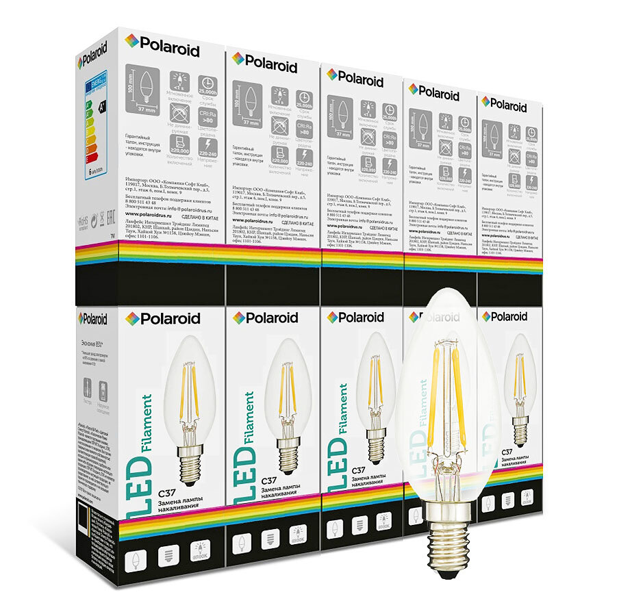 Филаментная светодиодная лампа Polaroid 220V C37 FIL 2,2W 6500K E14 250lm (10 шт.) информация: