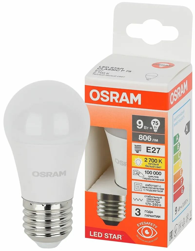 Отзывы на 5шт/уп. Лампа LED Шарик 9Вт 170-250В E27 806Лм 2700К Угол 180 град. d 45mm h 90mm Свет Теплый белый Osram, уп. 5шт