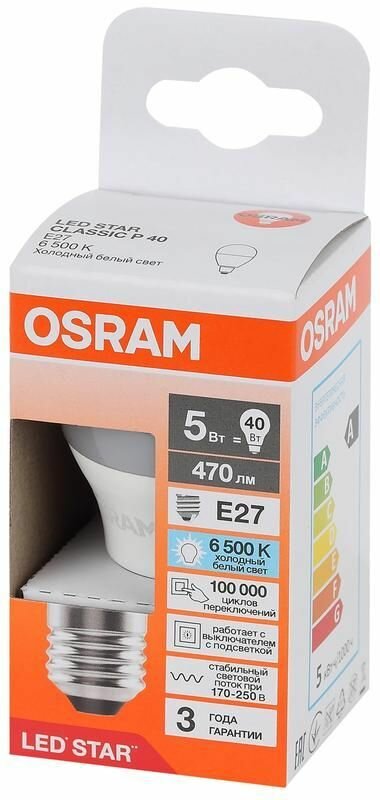 Отзывы на 5шт/уп. Лампа LED Шарик 5Вт 170-250В E27 470Лм 6500К Угол 180 град. d 45mm h 79mm Свет Холодный белый Osram, уп. 5шт