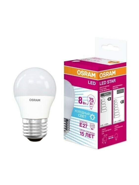 Отзывы на 5шт/уп. Лампа LED Шарик 8Вт 220-240В E27 806Лм 4000К Угол 150 град. d 45mm h 90mm Свет Дневной белый Osram, уп. 5шт