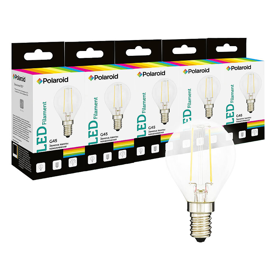 Филаментная светодиодная лампа Polaroid 220V FIL G45 2,2W 4000K E14 250lm (5 шт.) информация:
