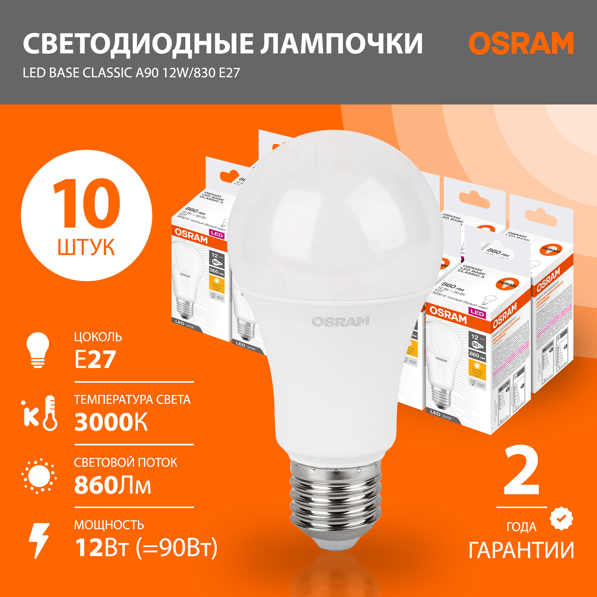 10 цен на Лампа E27 Osram LED BASE CLASSIC A90 12W/830, 860лм, 3000К, теплый свет, светодиодная, матовая, 10 шт