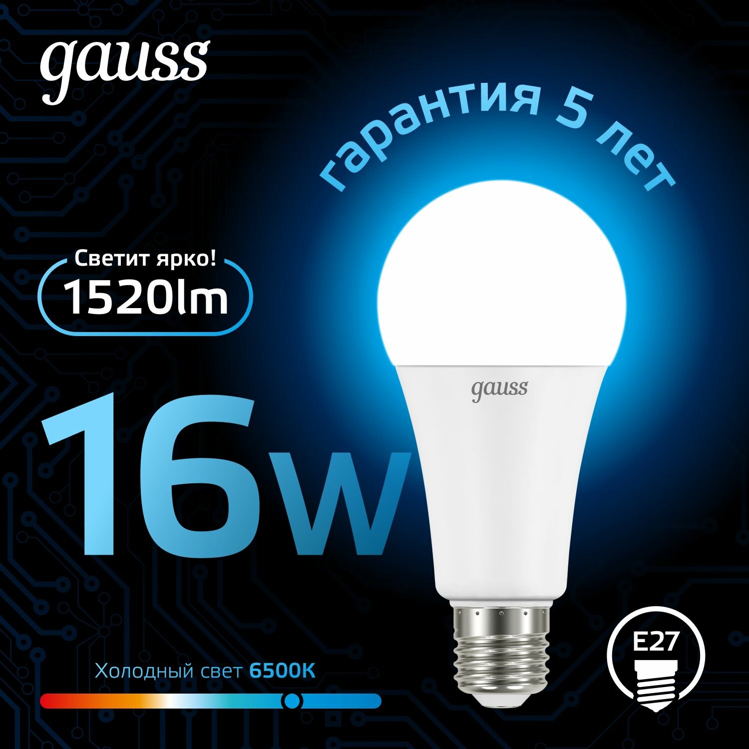 Лампочка светодиодная Е27 Груша 16W холодный белый свет 6500К упаковка 10 шт. Gauss Black информация: