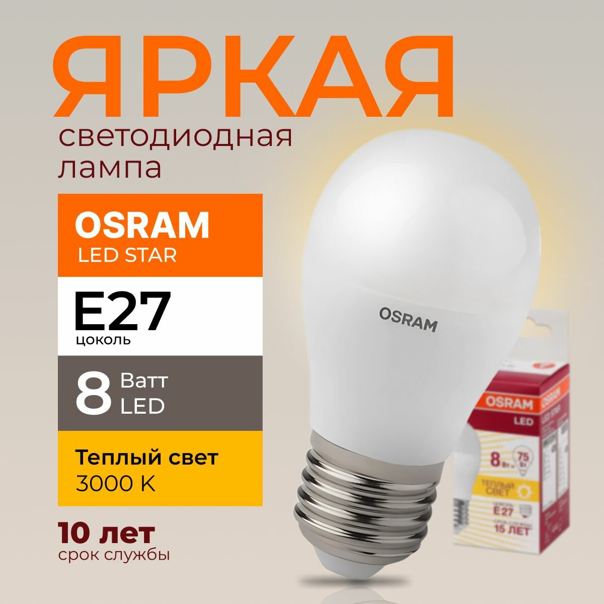 Отзывы на Светодиодная лампочка OSRAM 8 Ватт E27 3000K теплый белый, матовая шар, 220-240V, LED STAR, 830, 806лм