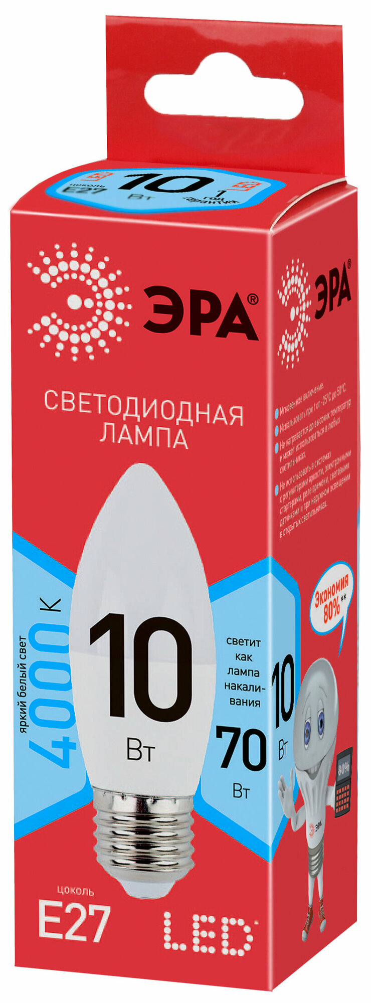 Лампочка светодиодная ЭРА LED B35-10W-840-E27 R 4000K свеча 10 Вт информация: