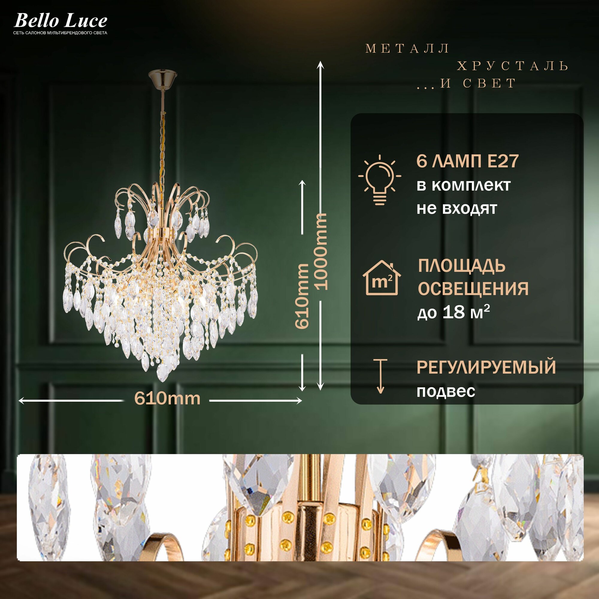 Отзывы на Люстра хрустальная золотая подвесная круглая с прозрачными хрустальными подвесками на 6 ламп E27, регулировка по высоте