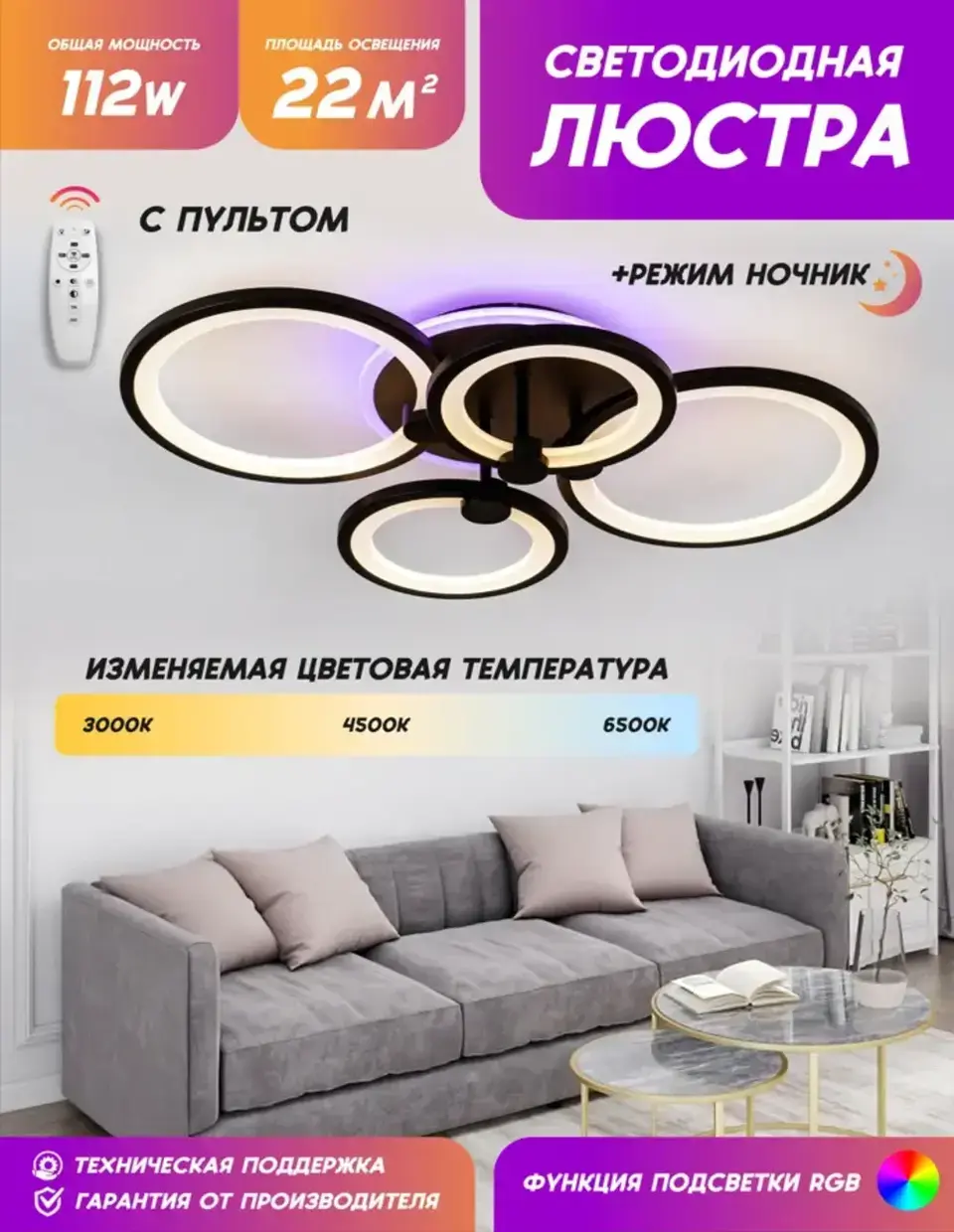 Люстра - ночник с пультом дистанционного управления ЯЛампа YA2413-4 BK информация: