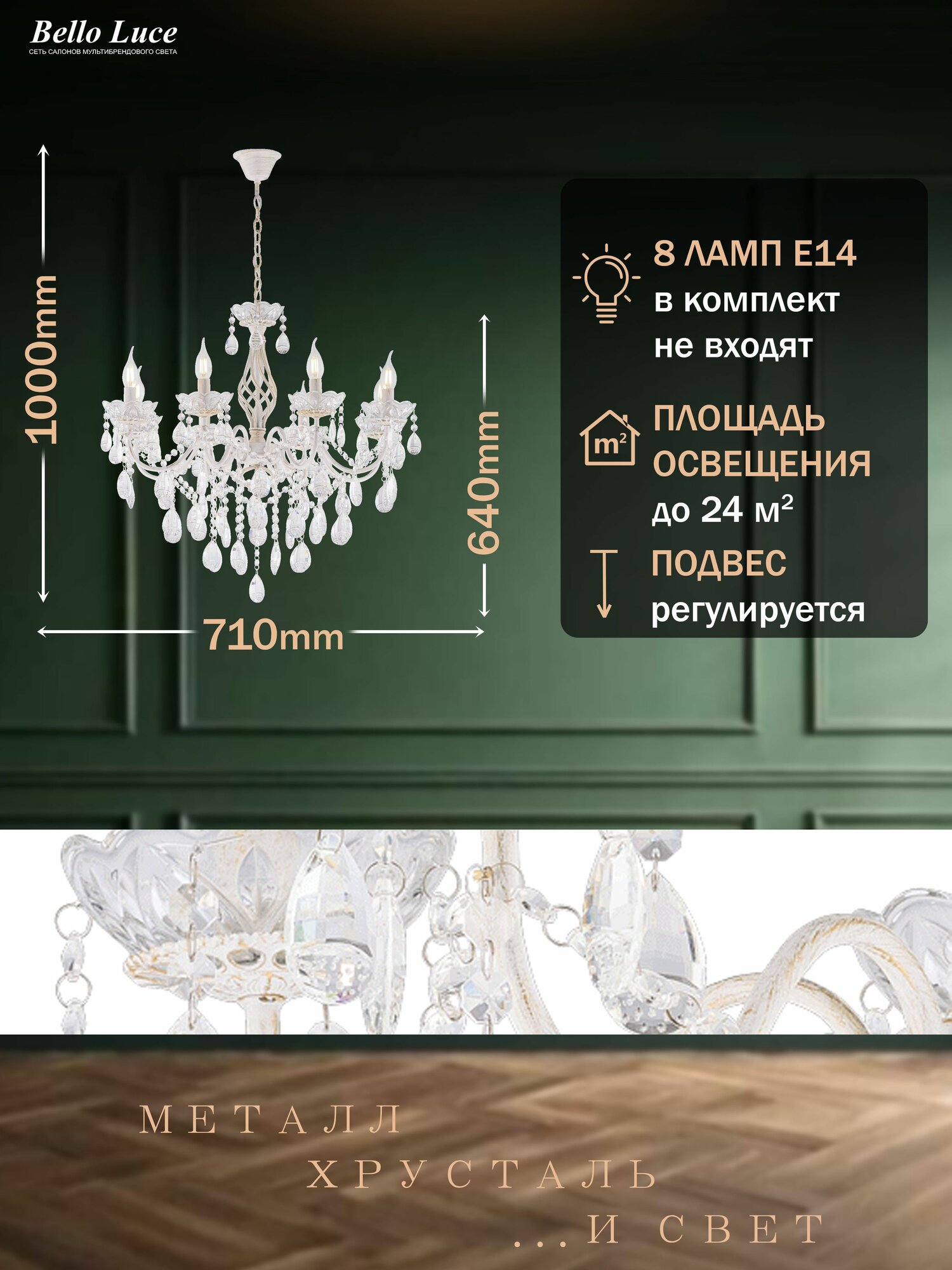 10 цен на Люстра хрустальная Классика белая+золото подвесная с прозрачными хрустальными подвесками на 8 ламп E14, регулировка по высоте