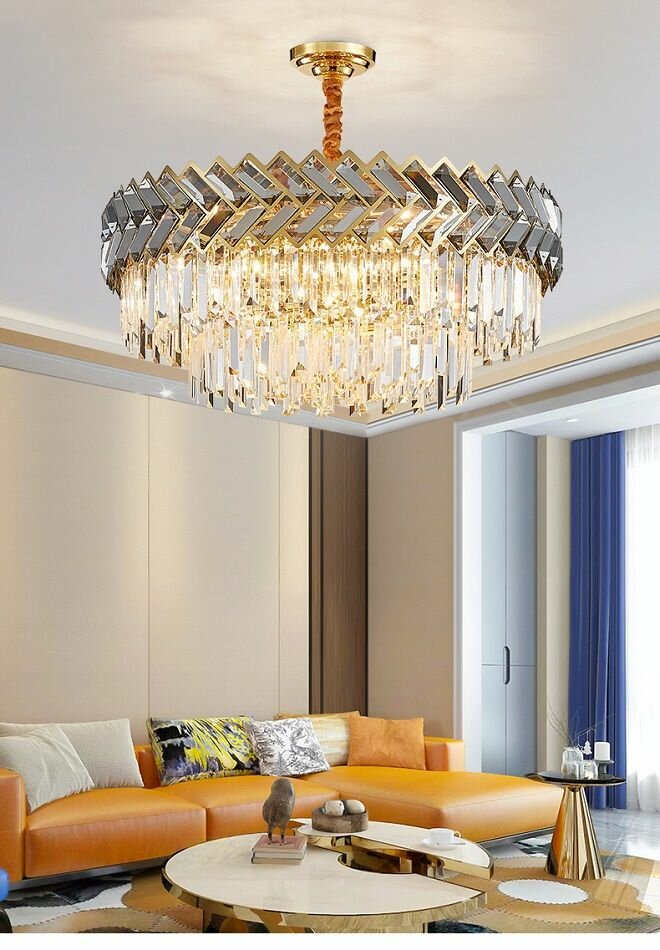 Люстра хрустальная золотая подвесная круглая с прозрачными хрустальными подвесками на 8 ламп E27, регулировка по высоте