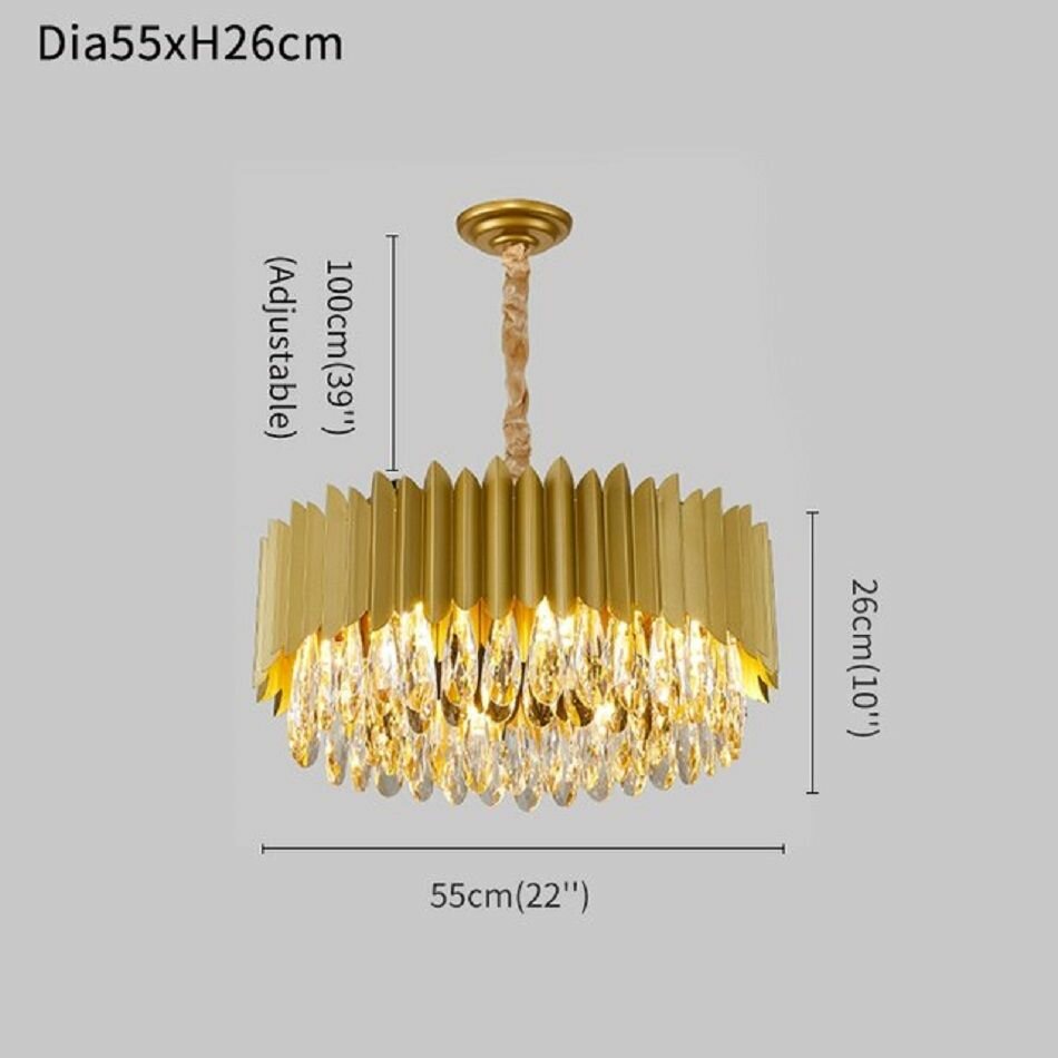 Люстра хрустальная золотая подвесная круглая с прозрачными хрустальными подвесками на 8 ламп E27, регулировка по высоте