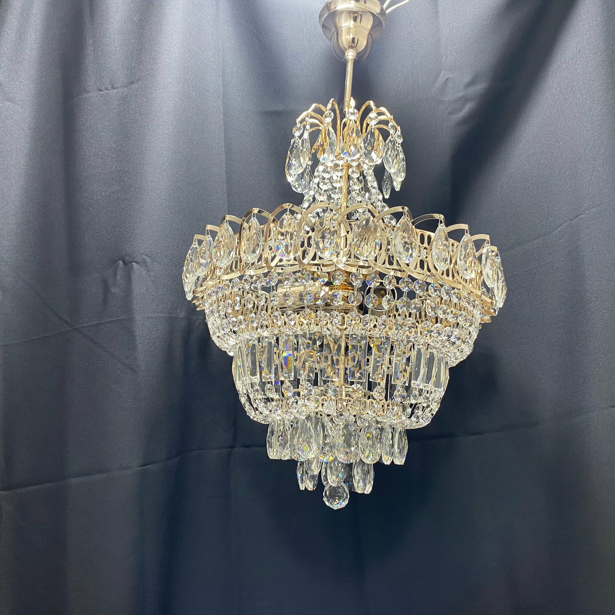 Люстра хрустальная золотая подвесная круглая с прозрачными хрустальными подвесками на 8 ламп E27, регулировка по высоте