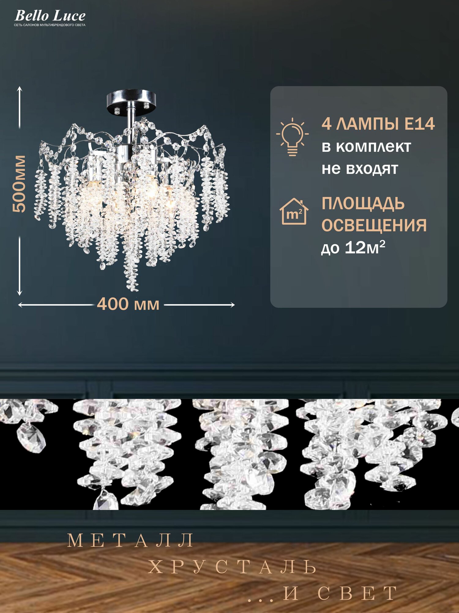 10 цен на Люстра хрустальная хром потолочная с прозрачными хрустальными подвесками на 4 лампы E14