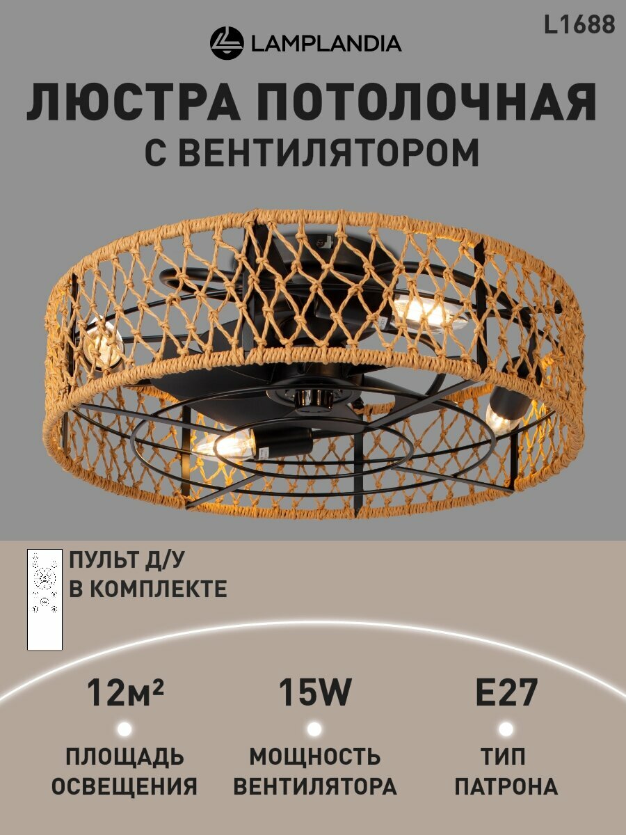 Отзывы на Люстра потолочная с вентилятором Lamplandia L1688 BREEZE NATURAL, E27*4 макс 40Вт, вентилятор 15Вт DS