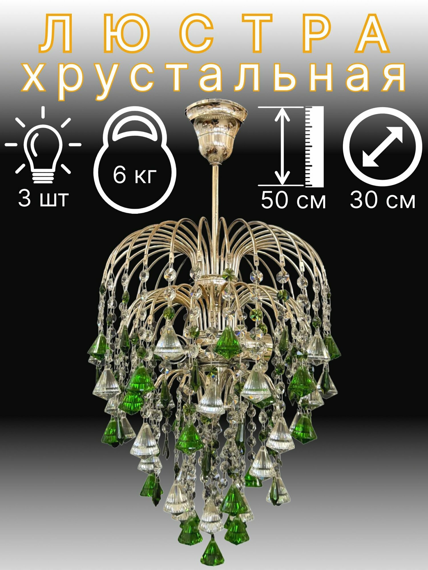 Отзывы на Люстра Потолочная Хрустальная "Брызги" Конус 3 лампы/Золото Зеленая