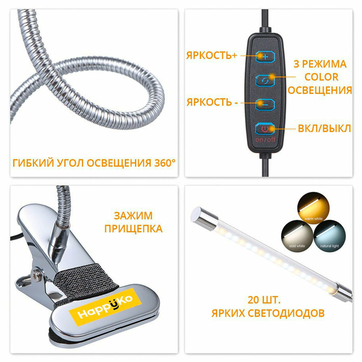 Светодиодная настольная лампа с прищепкой и гибкой ножкой 3 режима (Черная) информация: