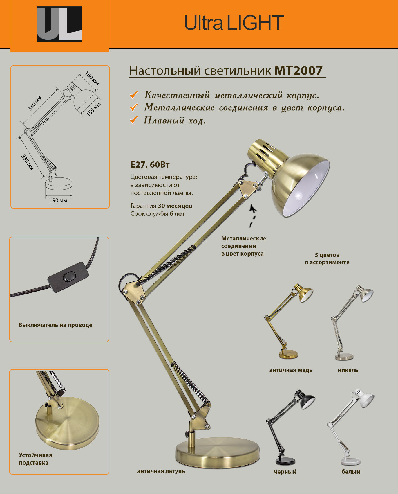Отзывы на Настольный светильник "Двухзвенный пантограф" Ультра Лайт, МТ2007,60Вт, 220 В, Е27, античная латунь