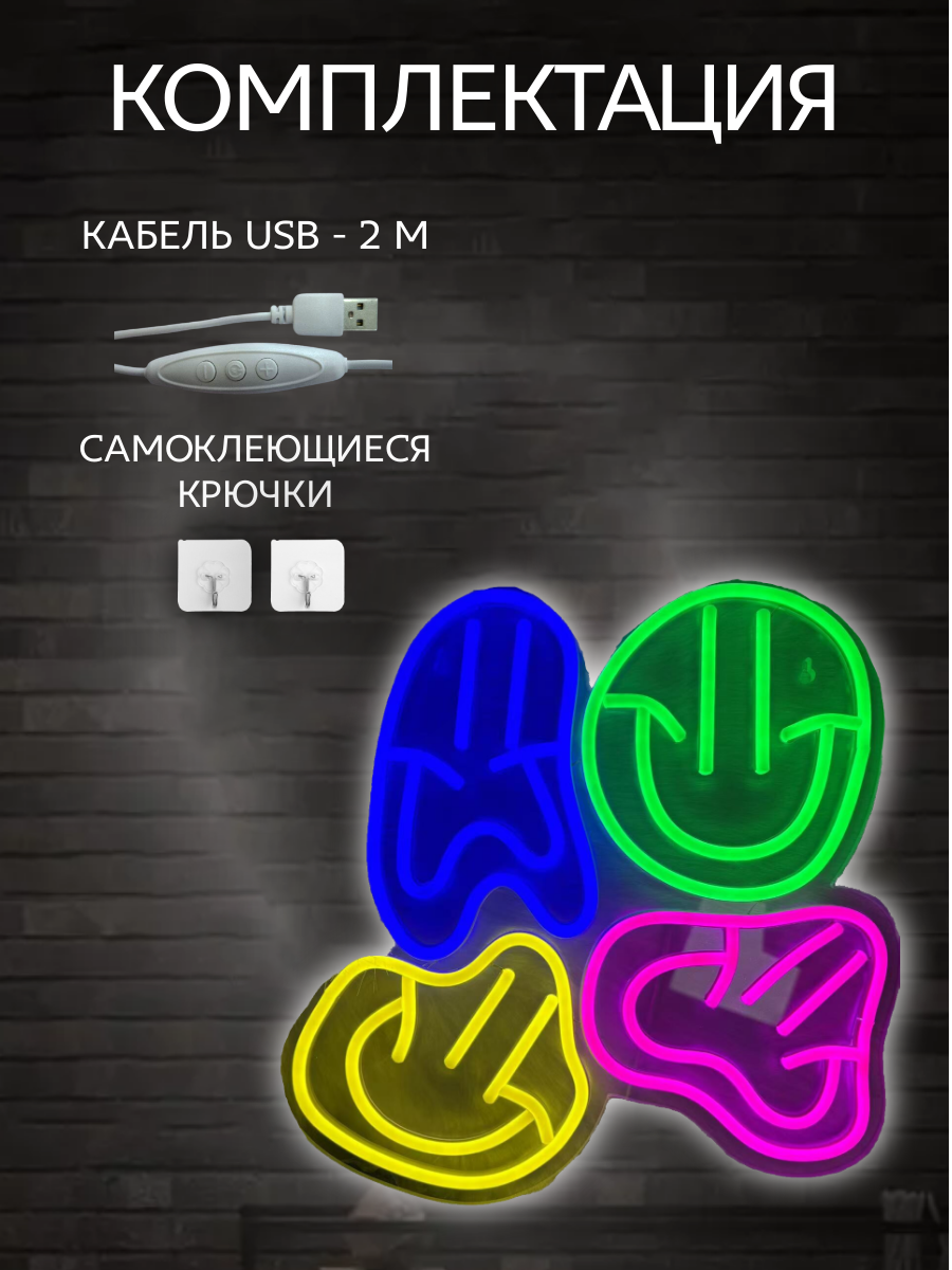 Неоновая вывеска-ночник, USB светильник смайлики, с держателями для крепления информация: