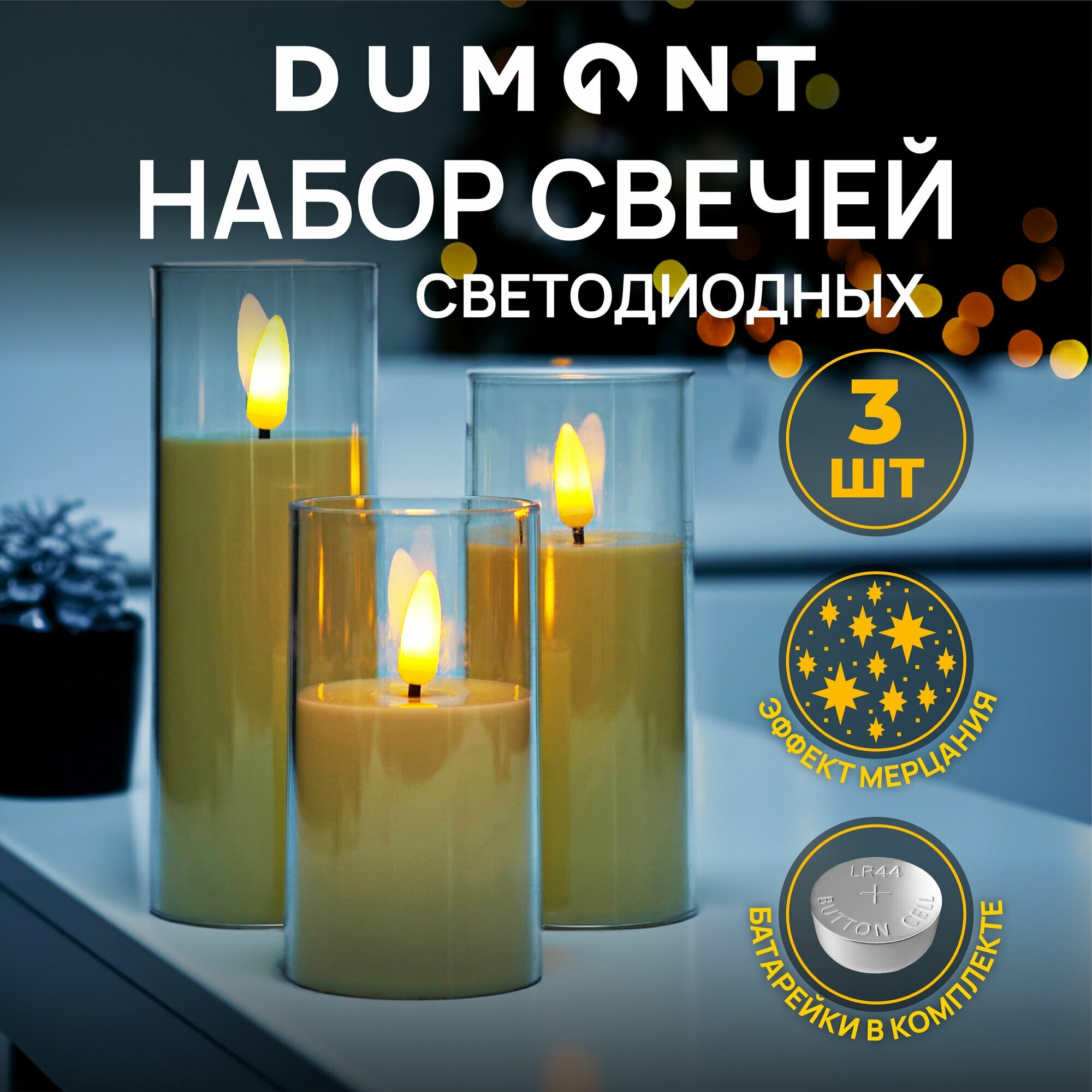Отзывы на Набор LED-свечей 3 шт. DUMONT в колбе на батарейках 3х LR44 с эффектом мерцания (с батарейками)