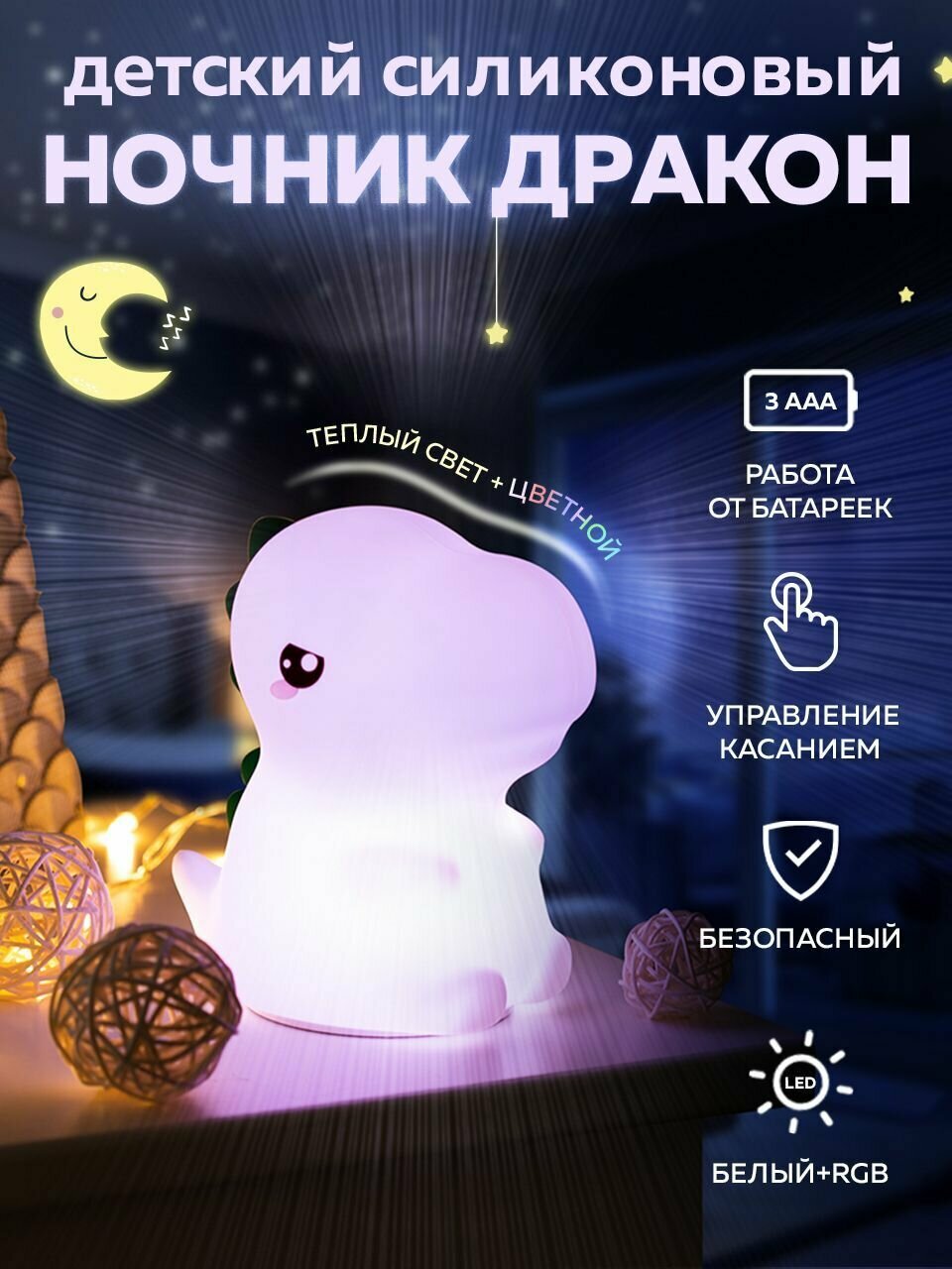 Ночник детский для сна силиконовый Дракон старт светильник на батарейках информация:
