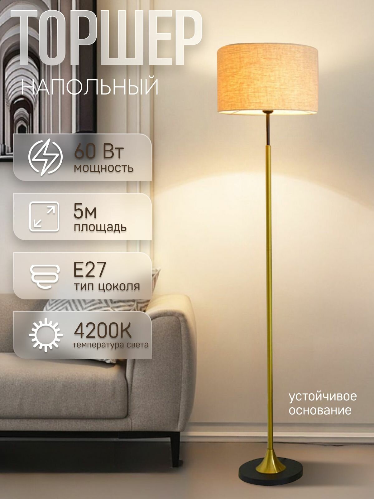 Отзывы на Торшер напольный ЭлисСвет светильник с тканевым абажуром, золотой 5851LF/1L BK+GD