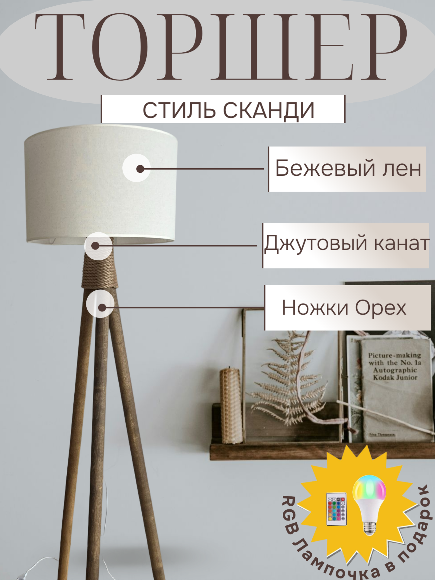 Отзывы на Торшер напольный деревянный, цвет Орех, бежевый лен абажур, стиль сканди, высота 155 см, ручная работа