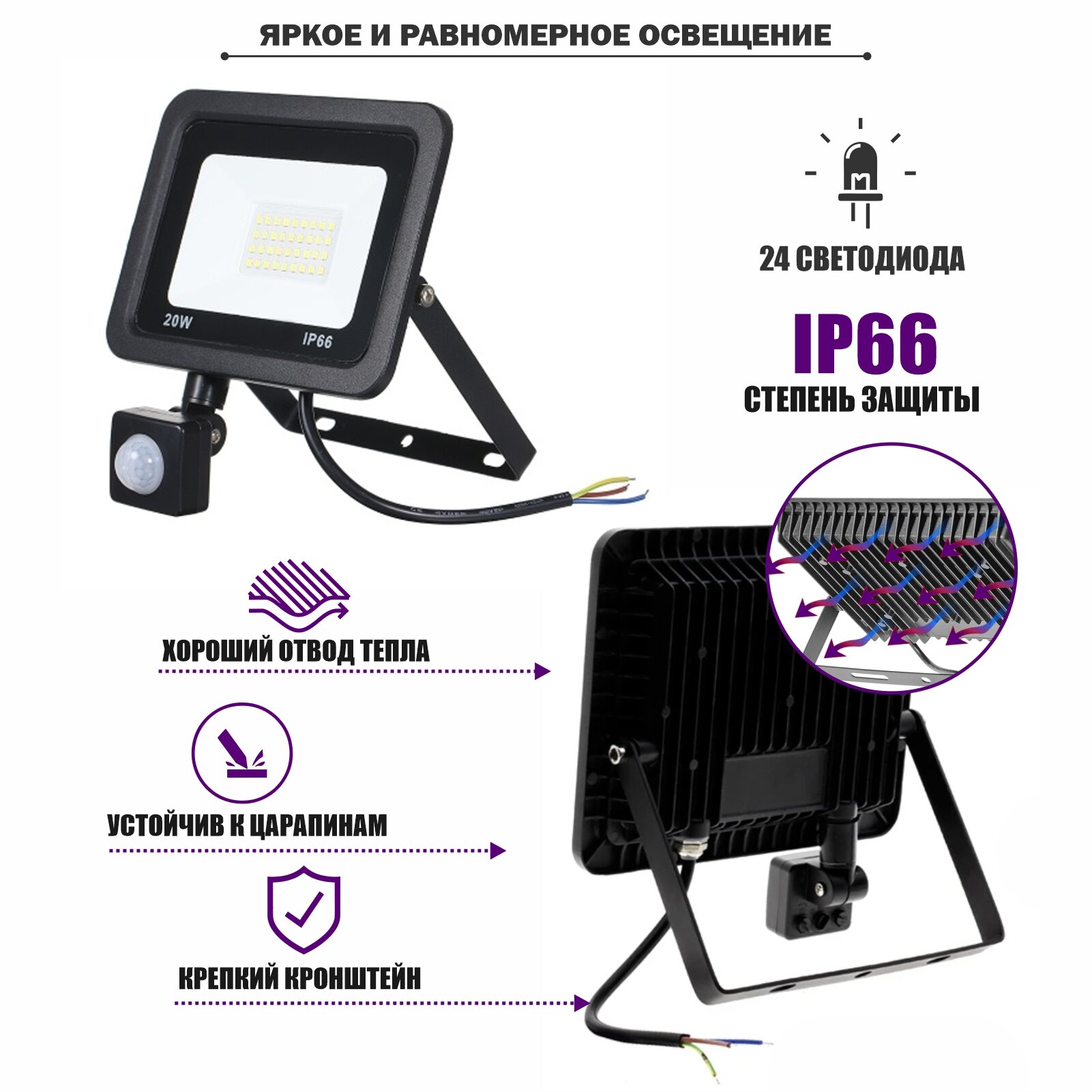 Светодиодный уличный светильник 20 Вт с датчиком движения информация: